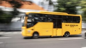 TANGERANG SELATAN — Insiden kecelakaan tunggal mewarnai arus lalu lintas pagi hari di kawasan Ciputat Timur, Tangerang Selatan, Senin (1/12/2025). Sebuah bus sekolah berwarna kuning terperosok (kejeblos) ke dalam lubang galian proyek perbaikan jalan, tepat di jam sibuk keberangkatan sekolah dan kerja.
