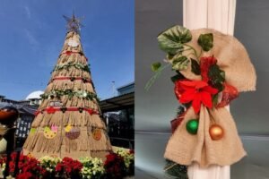 Karung goni yang berwarna cokelat tanah disusun sedemikian rupa membentuk kerucut pohon yang kokoh, memberikan kesan hangat, rustic, dan membumi. Sementara itu, ratusan batok kelapa yang telah dibersihkan dan dipoles digunakan sebagai ornamen pengganti bola-bola hiasan, menciptakan tekstur visual yang unik dan etnik.